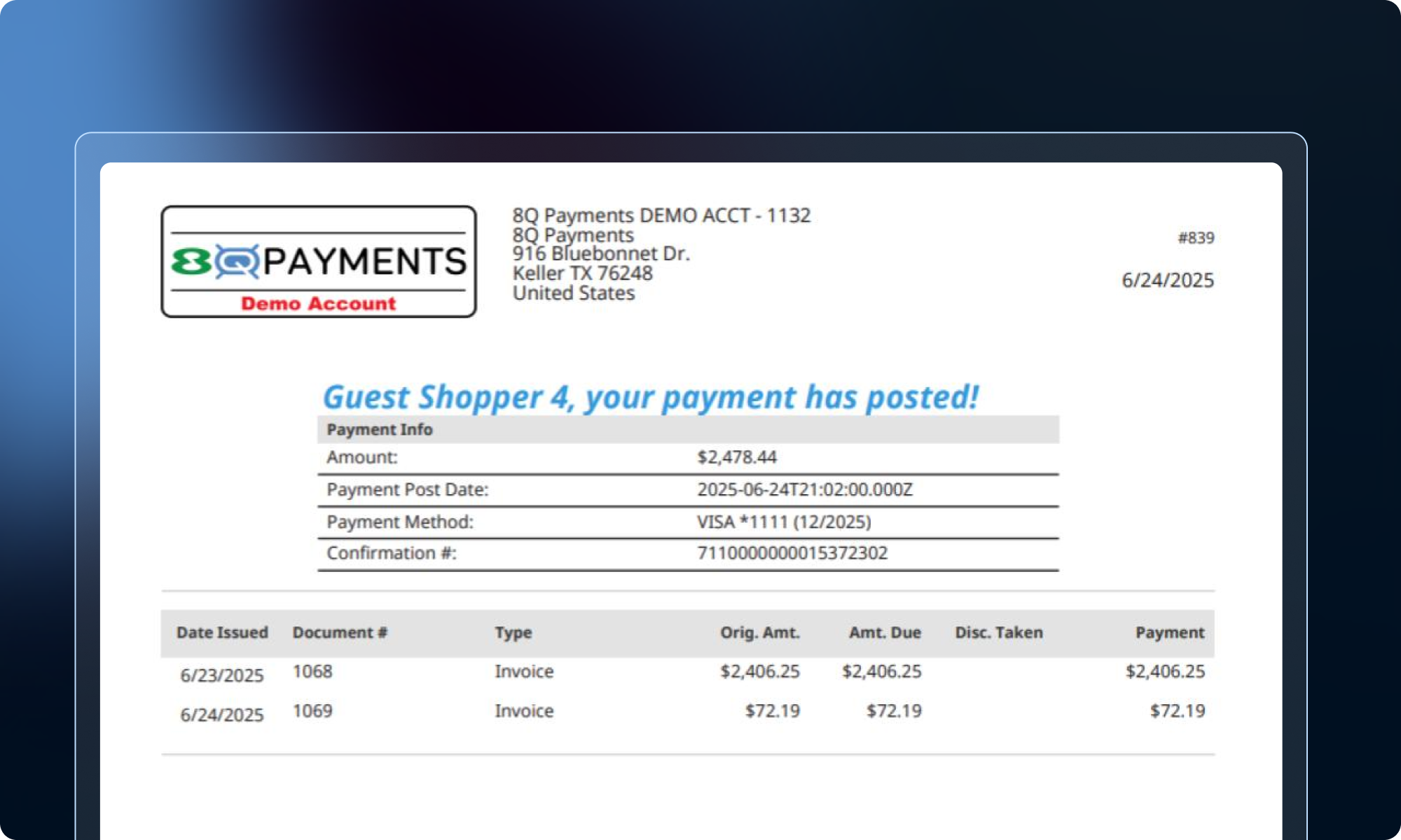 8Q Payments is an omni-channel , full-service payments plug-in, designed exclusively for NetSuite. This SuiteApp increases productivity and reduces training by automating recurring tasks and reducing keystrokes.